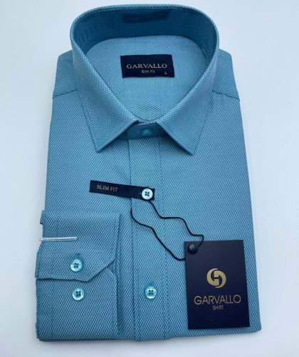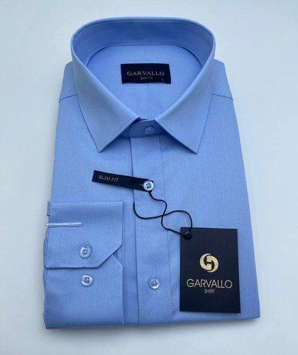 Cette chemise Garvallo pour homme est un modèle "Slim Fit" de couleur bleue. Elle présente un design épuré avec un col classique et une patte de boutonnage ornée de boutons blancs. Les manches longues sont dotées de poignets boutonnés et un pin's de col est visible sur l'un des poignets.
